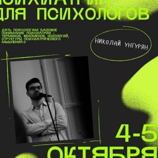 4-5 октября к нам приезжает наш друг Николай Унгурян, но он не просто друг, он врач психиатр-нарколог, который разработал супер крутой курс «Психиатрия для психологов».