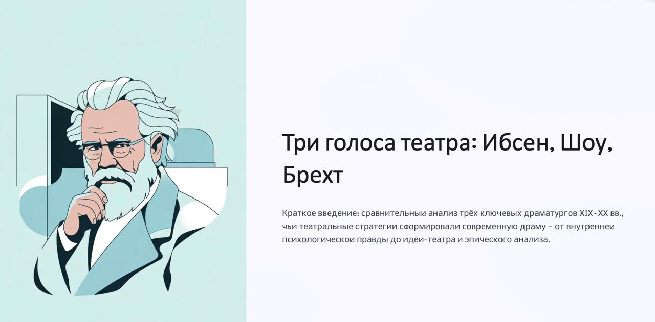 Мы придумали как сделать онлайн и готовы предоставить его вам после регистрации.Напоминаем, что встреча посвящена творчеству одних их самых значимых драматургов 19-20 веков Генрика Ибсена, Бернарда Шоу и Бертольда Брехта. Ибсен — внутреннее, Шоу — идейное, Брехт — аналитическое. Все трое трансформировали драматургический язык, предложив разные ответственные функции театра: раскрывать субъектность, обсуждать идею, обучать действию. Пройдем тесты на знание их творчества, разберем самые значимые произведения, обсудим ранний феминизм, связь войны и театральных постановок, а также роль войны в историческом контексте и почему история ничему не учит обывателя.