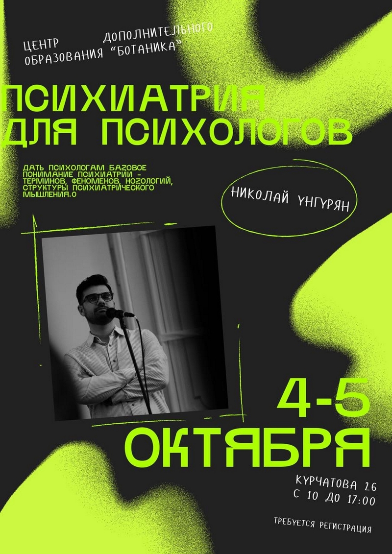 4-5 октября к нам приезжает наш друг Николай Унгурян, но он не просто друг, он врач психиатр-нарколог, который разработал супер крутой курс «Психиатрия для психологов».